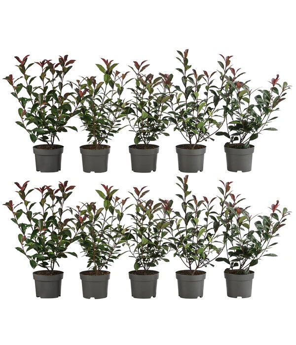 Eine Hecke übernimmt verschiedenste Funktionen für Ihren Garten, bildet sie doch den natürlichen Rahmen Ihres Grundstückes, bietet Ihnen einen angenehmen Sichtschutz und ist im Idealfall ein reizvoller Blickfang, der sogar Nützlingen und heimischen Vögeln einen Lebensraum bietet. Die Purpur-Glanzmispel ‚Carre Rouge‘ übernimmt diese Aufgaben nur zu gerne und setzt sogar noch einige positive Eigenschaften oben drauf! Denn mit diesem beliebten Zierstrauch, der schön buschig, aufrecht und dicht wächst, entsteht mit der Zeit eine stattliche Hecke, die dank ihrer immergrünen Belaubung das ganze Jahr über für Sichtschutz sorgt. Das heißt, Sie können auch in der sonst eher grauen Winterzeit das dunkelgrün glänzende Laub Ihrer Hecke bewundern. Das absolute Highlight der Purpur-Glanzmispel ist jedoch ihr purpurfarbener Neuaustrieb im Frühjahr, der Ihre Hecke in ein kontrastreiches Farbkleid hüllt. Ab April bringt ‚Carre Rouge‘ dann auch zahllose weiße Blüten hervor, aus denen sich im Herbst kleine rote Beeren entwickeln. Schmücken Sie also schon bald Ihre Gartengrenze mit diesem praktischen Heckenpaket der Purpur-Glanzmispel ‚Carre Rouge‘, mit je 10 Pflanzen für 2-3 Meter Hecke.