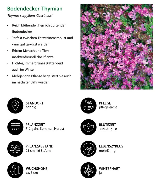 Viele Hobby-Gärtner denken bei dem Stichwort Bodendecker meistens an die Klassiker Efeu, Immergrün oder Dickmännchen. Doch es gibt noch viele andere kriechend wachsende Pflanzen, die diese Funktion erfüllen können. Wie wäre es zum Beispiel mit Thymian? Diese Bodendeckerstaude behält im Winter ihr dichtes, immergrünes Blätterkleid und schmückt sich im Sommer mit einem reichen Flor leuchtend purpurfarbener Blüten. Bei dieser Thymian-Art handelt es sich nicht um die beliebte Kräuterpflanze, sondern um die Ziervariante. Anders als viele andere Bodendecker macht der Thymian nicht nur mit seinem Blatt- und Blütenschmuck auf sich aufmerksam, sondern verwöhnt alle, die sich ihm nähern, mit wunderbarem Duft. Die robuste Gartenpflanze wird gerne im Steingarten eingesetzt, sie begrünt aber auch Mauerkronen und findet Verwendung bei der Grabbepflanzung, sofern der Standort ausreichend sonnig ist. Zierthymian gedeiht aber auch hervorragend in Töpfen und Pflanzkübeln, über die er schon nach kurzer Zeit seine Triebe vorwitzig hängen lässt. Außerdem ist Zier-Thymian eine beliebte und begehrte Bienenweide.