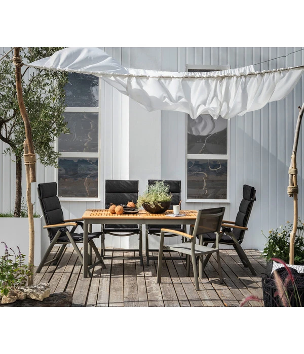 Wenn im Sommer nach einer stressigen Woche der Kalender den Freitag anzeigt und die Wettervorhersage bestes Sommerwetter für die nächsten Tage prophezeit, werden Sie bestimmt ein entspanntes Wochenende im Garten oder auf dem Balkon planen. Und wer könnte Sie besser durch dieses tolle Wochenende begleiten als der Stapelstuhl Colmar! Denn der Stapelstuhl Colmar ist so bequem, dass Sie am liebsten jede Stunde in ihm verbringen würden – vom Frühstück in der Morgensonne bis zum Mitternachtsimbiss unterm Sternenhimmel. Doch dieser Gartenstuhl wird Sie nicht nur mit seinem unvergleichlichen Sitzkomfort verwöhnen, sondern Ihre Terrasse auch mit seiner edlen Optik bereichern. Nicht ohne Grund ist die Kombination aus einem Leichtmetall-Gestell, modernem Funktionsgewebe und edlen Teak-Armlehnen, wie sie der Stapelstuhl Colmar zeigt, im Moment absolut Trend, denn sie vereint moderne Funktionalität mit wohnlicher Ausstrahlung.
