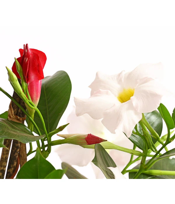 Prachtvolle zweifarbige Trichterblüten in strahlendem Weiß und leuchtendem Rot erheben sich über glänzend dunkelgrünem Blattwerk – gäbe es für Pflanzen einen Schönheitswettbewerb à la Miss World, das zweifarbige Dipladenien-Duo von Dehner hätte gute Chancen auf das begehrte Siegeskrönchen. Wäre es nicht faszinierend, wenn Sie Ihre grüne Oase auf dem Balkon oder der Terrasse mit dieser beeindruckenden Kletterpflanze bereichern könnten? Dipladenien sind zwar eigentlich das tropische Klima Südamerikas gewöhnt, können aber bei uns in den warmen Sommermonaten problemlos im Freien stehen. Und an einem Plätzchen, das ihren Wünschen entspricht, wird sich dieser exotische Kletter-Star sogar als erfreulich unkompliziert erweisen.