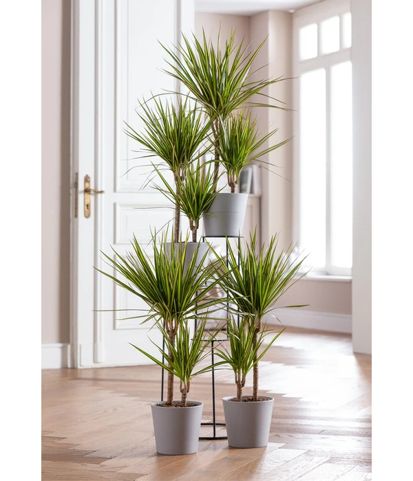 Erfahrene Raumgestalter wissen seit langem um den Dekorationswert exotischer Grünpflanzen. Vor allem Pflanzen wie der Drachenbaum ‚Sunray‘ von Dehner eignen sich perfekt, um in einem großzügigen Wohnambiente interessante Akzente zu setzen und in Zusammenspiel mit ausgewählten Deko-Objekten eine exotische Atmosphäre zu inszenieren. Drachenbäume sind ideal für Grünpflanzenliebhaber, die unkomplizierte Pflanzen schätzen, aber auf eine elegante Erscheinung nicht verzichten möchten. Der Drachenbaum ‚Sunray‘ wird alle entsprechenden Wünsche erfüllen. Die schmalen, spitz zulaufenden Blätter, die in Büscheln an dem aufrechten Stamm wachsen, zeigen ein helles Blattgrün umrandet von einem dunklen, rötlich-braunen Streifen und sorgen so für eine freundliche Stimmung im Raum.