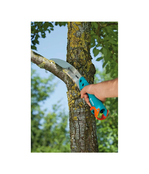 Die Einsatzmöglichkeiten der gebogenen GARDENA combisystem Gartensäge 300 P sind vielfältig: Mit ihrem ergonomischen Griff und den angenehmen Soft-Kunststoff-Komponenten liegt die Säge gut in der Hand und ist bequem manuell einsetzbar. Sie hilft aber auch, wenn Sie nicht auf die Leiter steigen wollen: etwa für Äste, die vom Boden aus gar nicht zu erreichen sind, oder für den Rückschnitt von Kletterpflanzen wie Wildrosen, welche das Spalier oder die Hauswand schon weit erklommen haben. Für diese Zwecke ist die gebogene GARDENA combisystem Gartensäge 300 P auch ganz leicht erweiterbar. Sie kann an einen teleskopierbaren combisystem-Stiel angebracht werden und reicht dann in bis zu 5 Meter Höhe. Dazu wird sie an einem Sicherheitsverschluss befestigt. Die GARDENA combisystem Gartensäge 300 P ist ein robustes und leistungsstarkes Werkzeug, das gebogene Sägeblatt von 340 Millimeter Länge ist wegen seiner impulsgehärteten Zugverzahnung mit 3fach-Schliff äußerst scharf.