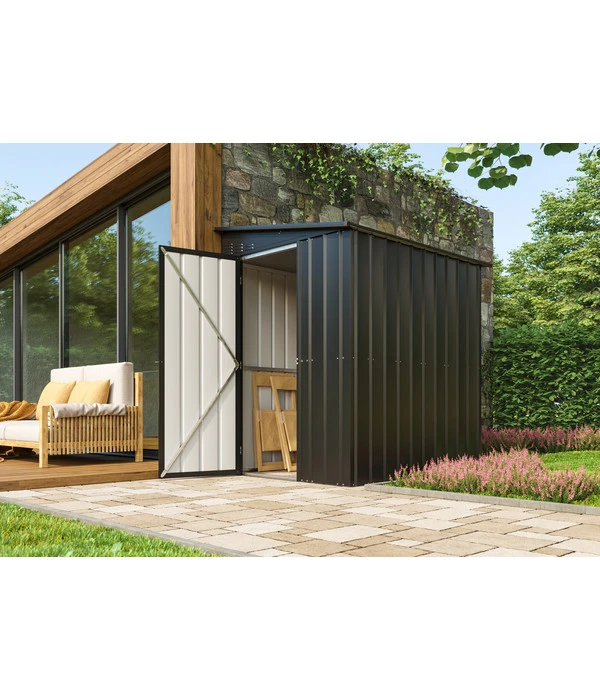 Es ist erstaunlich, wie viele Gartengeräte sich auch in einem kleinen Gärtchen ansammeln. Rasenmäher und Bewässerungsschlauch, Pflanzerde, Hacken, Spaten, Besen und natürlich würde man auch gerne Sonnenschirm, Liegestuhl und das Kinder-Outdoorspielzeug wettergeschützt unterbringen. Deshalb wurde das Globel Anlehnhaus Grat entworfen. Es hat nur eine kleine Grundfläche, bietet Ihnen aber mit einer gleichbleibenden Deckenhöhe von über 2 m und einer Türhöhe von 178 cm ein Maximum an Stauraum und Komfort. Dafür sorgt auch die breite Schwingtür, die sich nach Außen öffnet und so einen bequemen Zugang ins Innere ermöglicht, ohne Platz im Haus zu brauchen. Außerdem hat das moderne Pultdach eine relativ starke Neigung, so dass für das sichere Ablaufen von Regen und Schnee gesorgt ist. Geben Sie Ihren Gartengeräten und Co einen sicheren und wettergeschützten Ort – im Globel Anlehnhaus Grat!