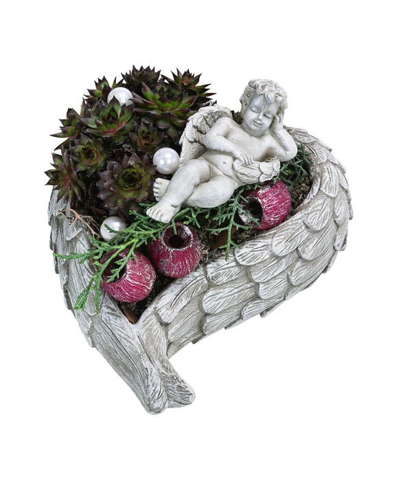 Natürlich ist schon die Herzform der schön gearbeiteten Schale mit Flügeln im Vintage-Stil, die unsere Floristen mit dem immergrünen Hauswurz bepflanzt haben, ein bekanntes Symbol für die Liebe. Dank der Beton-Schale können Sie das Gesteck im Handumdrehen umstellen oder mitnehmen. Als echter Blickfang der Kreation, zwischen frischen Arizonika-Zweigen, Moos und Eukalyptus-Glocken, ruht außerdem ein kleiner, liebenswerter Engel. Er möchte die Geschichte von einer Liebe, die nicht mit dem Tod endet, sondern ewig währt, erzählen. Der Engel wird als Sinnbild der himmlischen Wesen gesehen, die als Mittler zwischen Himmel und Erde, aber auch als Tröster und Wächter gelten.