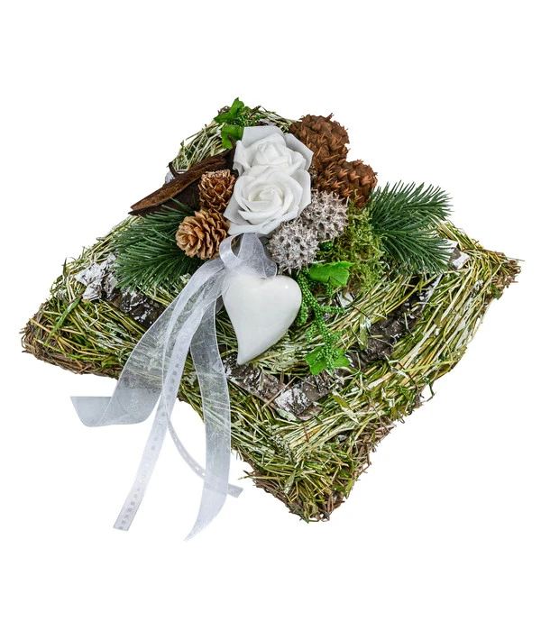 Wenn Sie eine moderne und zugleich stilvolle Dekoration für die letzte Ruhestätte suchen, dann ist das Grabgesteck Perth von Dehner sicher die richtige Wahl. Auf der Unterlage, die aus Heu und Rindenstücken gefertigt wurde, sorgen die künstlichen Zweige und das Moos für ganz natürliche Farbtöne. Jedes Gesteck ist handgefertigt. Man sieht gleich, mit wie viel Liebe zum Detail dieses Grabgesteck entworfen wurde. Die weißen Seidenrosen und das ebenfalls weiße Herz aus Keramik bilden den optischen Mittelpunkt dieses glanzvollen und doch zugleich dezenten Grabschmucks. Abgerundet wird die Komposition durch das weiße Seidenband und die echten Zapfen.
