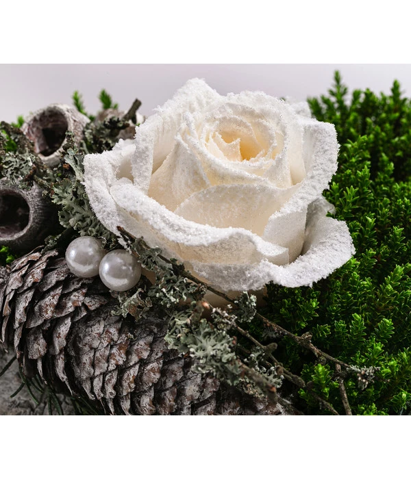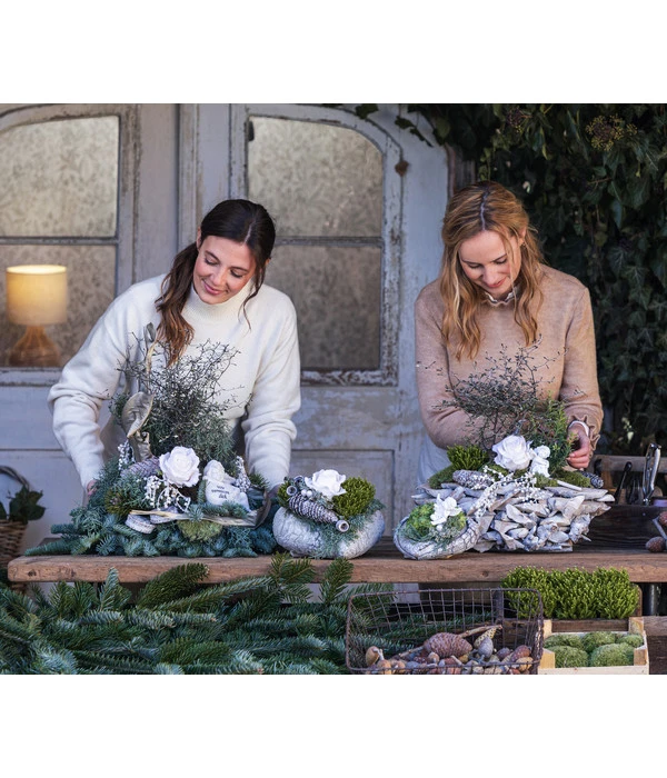 Liebevoll von Hand haben erfahrene Floristen dieses Gesteck Stille hergestellt und dabei auf winterliche Farben wie Weiß und Silber gesetzt, ergänzt um grünes Beiwerk. Wer genau hinsieht, wird viele Naturelemente in Whitewash-Optik, wie Zapfen oder Canella in diesem Grabschmuck entdecken. Sehr eindrucksvoll wirkt auch die ovale Jardiniere aus geweißtem Treibholz, die die Form eines Schiffs aufgreift und so eine tröstliche Botschaft vermittelt. Durch die getragenen Farben passt das Gesteck Stille zu jedem Grab, unabhängig von Grabstein und Bepflanzung, und wirkt besonders auf großen Familiengräbern imposant und pietätvoll.