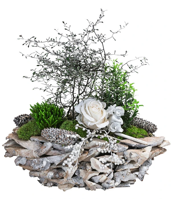 Sie wünschen sich für Allerheiligen, Allerseelen oder für den Totensonntag ein schönes, großes Grabgesteck, das nicht zu überladen wirkt und etwas Besonders ist? Das Gesteck Stille vereint diese Wünsche und bringt zudem tröstende Elemente mit, die Sie in Ihrer Trauer nicht alleine lassen. Das Herzstück dieses erlesenen Arrangements ist ein kleiner Engel, der neben einer wunderschön beschneiten Kunstrose ruht und Ihre lieben Verstorbenen in die nächste Welt begleiten wird. Das Engelchen ist aber noch nicht alles, denn die Floristen haben diese himmlische Botschaft mit den Pflanzenelementen fortgeführt. Bizarr geformte Äste des Zickzack-Strauchs umschlungen von immergrünem Spindelstrauch, Polstermoos und Hebe recken sich hinter der Figur empor und unterstreichen die würdevolle Atmosphäre, die dieses Trauergesteck ausstrahlt.