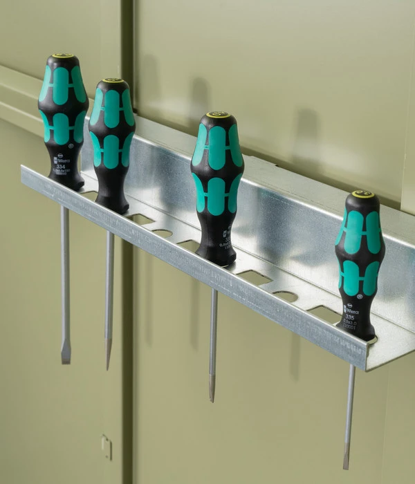 Wenn Sie immer wieder Ihre Schraubenzieher, -schlüssel und Zangen suchen, dann wird es Zeit, einen geeigneten Aufbewahrungsort für diese zu finden. Mit dem praktischen Hörmann Werkzeughalter haben Sie eine perfekte Lösung, die sich schnell und einfach integrieren lässt. Egal, ob im Gartenhaus, in der Garage oder in Ihrem Werkraum, der Werkzeughalten lässt sich dank dem im Lieferumfang enthaltenen notwendigem Befestigungsmaterial im Handumdrehen an die Innenwand anbringen.