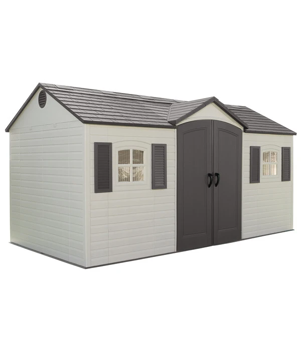 Vom Giebel bis zur Bodenplatte ist das Lifetime Gerätehaus Garten-Villa eine sehr stabile Konstruktion mit Wänden aus doppelwandigem, metallverstärktem HDPE-Kunststoff (Hart-Polyethylen), der absolut witterungsbeständig, sehr einfach zu reinigen und sogar recycelbar ist. Das solide Dach besteht aus Hochleistungsstahl und ist in der Lage, eine Schneelast von 115 kg/m² zu tragen, während die Dachneigung von 23 % ein schnelles Ablaufen des Regenwassers garantiert. Aufgebaut wird das Lifetime Gerätehaus Garten-Villa am besten von 2 Personen; dank der Steck- und Schraubverbindungen ist die Arbeit in ca. 4 Stunden erledigt.