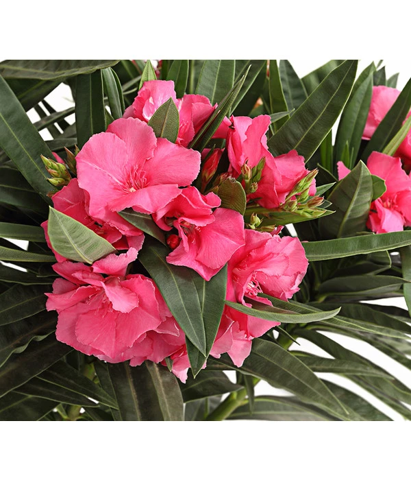 Geben Sie dem Oleander einen vollsonnigen, warmen Platz und sorgen Sie für eine ausreichende Wasserversorgung. Gerne darf auf dem Untersetzer etwas Gießwasser stehen bleiben, damit er sich zwischen den Gießintervallen bedienen kann. Seine Blühfreude können Sie mit regelmäßigen Düngergaben anfeuern, für den kompakten Wuchs sollten Sie jedes Jahr 1-3 der älteren Triebe knapp über dem Boden abschneiden. Den Winter verbringt der robuste Oleander an einem hellen, frostfreien Ort bei Temperaturen zwischen 2° und 10°C. Während des Winters wird nur wenig gegossen.