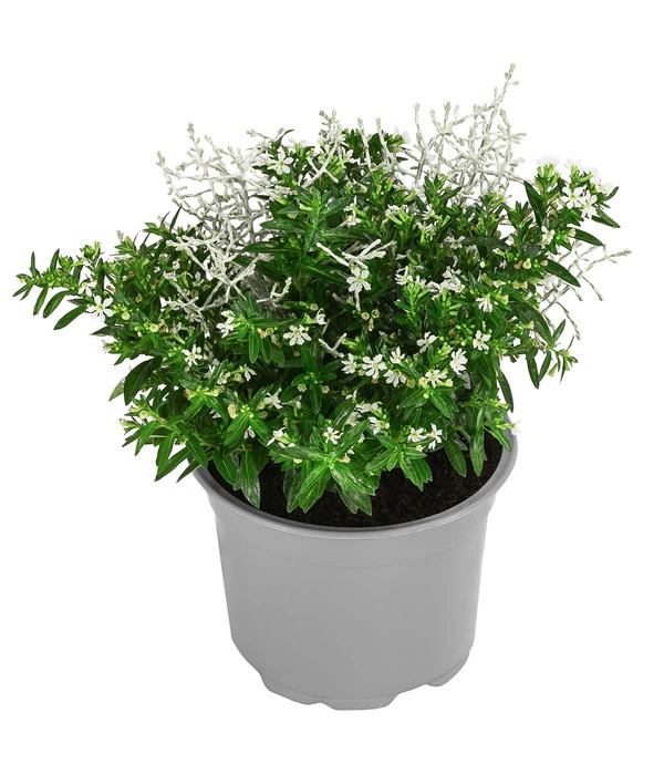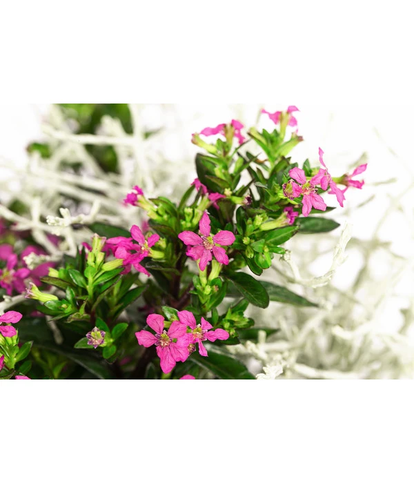 Es gibt inzwischen nicht wenige, für die nicht der Sommer die schönste Zeit des Jahres ist, sondern der Herbst. Die Temperaturen sind nicht mehr so heiß, die Luft frischer, die Farben sanfter; und weil man weiß, dass dies der Übergang zum Winter ist, weiß man jede Pflanze, jede Frucht und jede Blüte besonders zu schätzen. Mit dem Pflanzen-Duo Herbstbrise können wir Ihnen ein besonders reizvolles Pflanzenpaar vorstellen, das nicht mit lauten Farben auf sich aufmerksam macht, sondern sich viel subtiler und eleganter in Szene setzt. Das Köcherblümchen (Cuphea) ist ein pflegeleichter Dauerblüher, der ursprünglich in Mittelamerika zu Hause ist und von Mai bis Oktober unzählige zarte, rosa-, weiß- oder lilafarbene Blüten zur Schau stellt. Das Gitterkraut (Calocephalus) möchte dem Köcherblümchen nicht die Schau stehlen und verzichtet auf Blüten, in der Gewissheit, dass er auch mit seiner bizarren Wuchsform und dem eleganten Silberton für Aufsehen sorgen wird. Tipp: Holen Sie sich das Pflanzen-Duo Herbstbrise am besten gleich in mehreren Farbstellungen – dann wird die dekorative Wirkung noch bezaubernder sein.