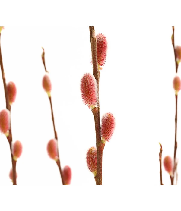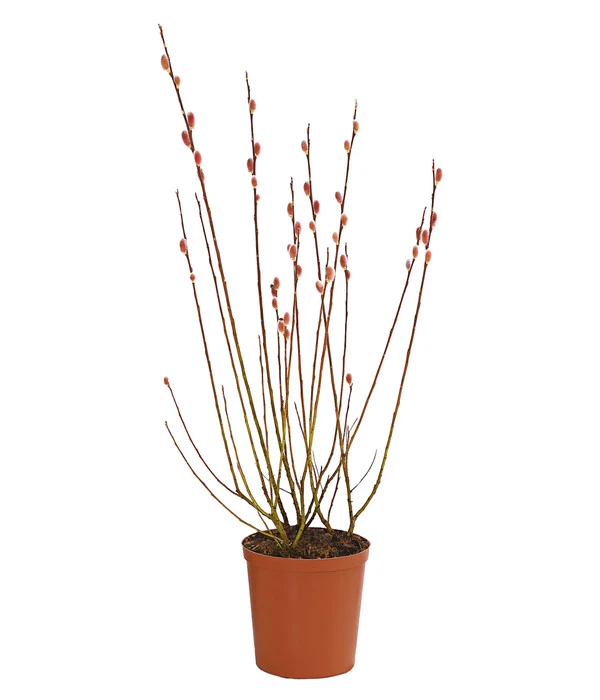 Jeder kennt die silbernen Kätzchen, die im zeitigen Frühjahr an den Weiden erscheinen und den Frühling ankündigen. Aber haben Sie diese Frühlingsboten schon einmal in einem roten Kleid gesehen? Dann sollten Sie dieses Kätzchen näher in Augenschein nehmen. Denn hier zeigen sich die sonst silbernen Flauschbällchen in einem kräftigen Rosaton. Ein toller Schmuck im Garten, gerade wenn sich die meisten anderen Blütensträucher noch im Winterschlaf befinden oder gerade mit dem ersten Blattaustrieb beginnen. Und noch einen Vorteil hat es, diese dekorative Kätzchen-Weide im eigenen Garten zu haben. Denn die Zweige mit den flauschigen Bällchen sind auch ein toller Vasenschmuck, der Frühlingsstimmung im Haus verbreitet. Besonders zu Palmsonntag ist dies in vielen Gegenden ein beliebter Brauch. Die Rotkätzchenweide, die auch unter den Namen Sal-Weide oder Palm-Weide bekannt ist, ist ein schnellwüchsiger und unkomplizierter Strauch, der als Solist, in gemischten Buschgruppen oder sogar als Heckenpflanze genutzt werden kann. Und da das Kätzchen auch als Kübelpflanze gedeiht, kann es auch Balkone und Terrassen schmücken.