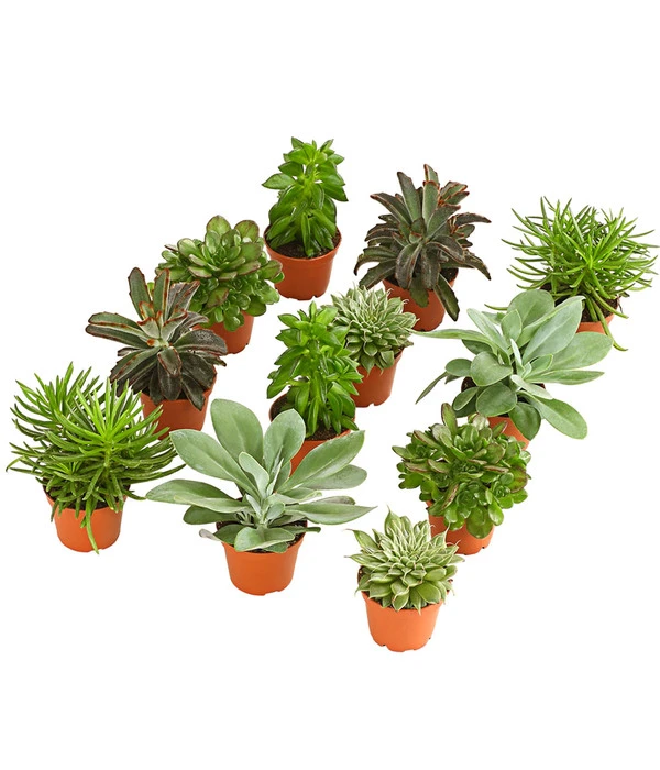 Sie haben große Fensterflächen im Süden oder sonnige Stellen auf der Terrasse, die Sie gerne mit etwas Grünem schmücken würden? Dann werden Ihnen diese unterschiedlichen, kleinen Gewächse bestimmt spontan gefallen. Denn der Sukkulenten-Mix bietet Ihnen eine formenreiche Auswahl schönster Mittagsblumengewächse, die sich genau an diesen Stellen wohlfühlen werden. Kaum zu glauben, in welcher Formenvielfalt die Natur ihre fleischigen Blättchen erschaffen hat! Ganz gleich, ob lang und spitz, breit und rund oder spatelförmig – jedes einzelne davon ist ein echter Hingucker. Aber damit nicht genug. Denn bei jeder Sukkulente verzaubert auch das Arrangement der Blätter seinen Betrachter. Bewundern Sie die Rosettenform, etagenartig angeordnete Blätter oder auch gefächerte Exemplare! Mit anderen Worten: die hübschen Mitglieder aus diesem Sukkulenten-Mix sollten baldmöglichst Ihre Wohnung oder den Garten schmücken!