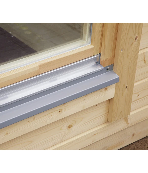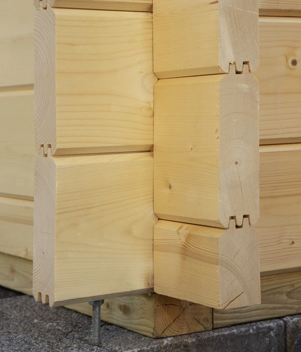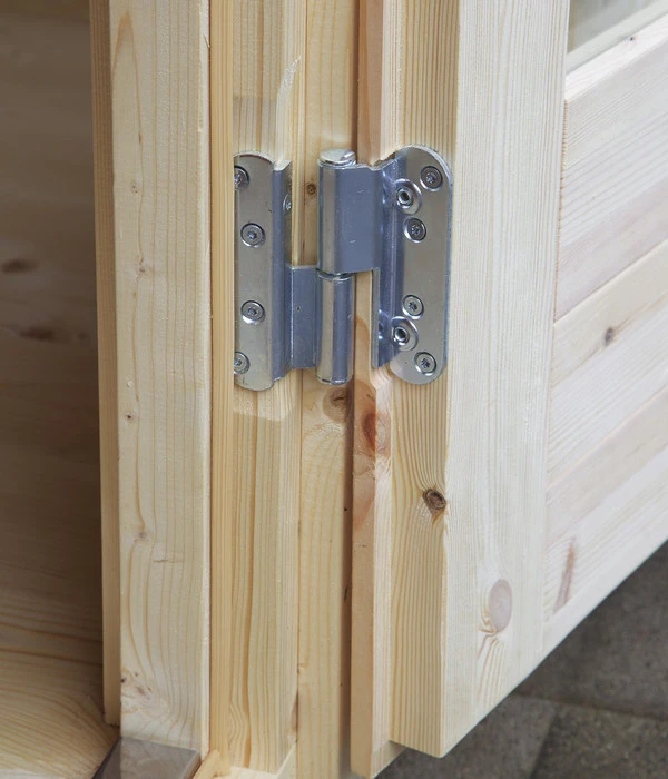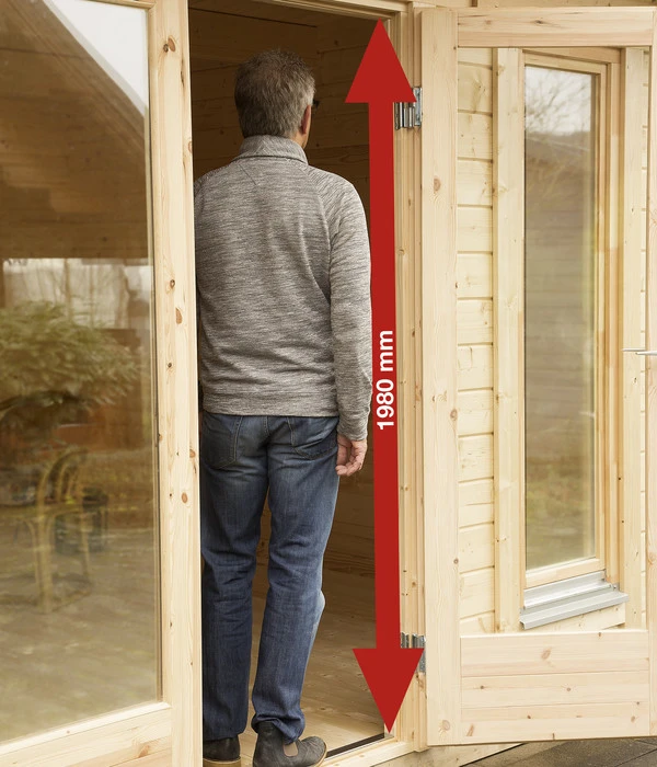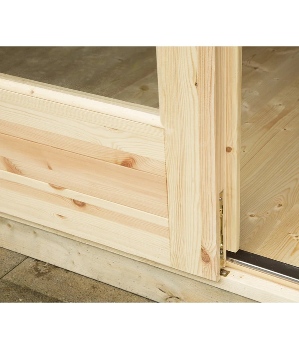 Der Boden besteht beim Wolff Finnhaus Gartenhaus Trondheim 70-D XL, inkl. Lounge rechts aus 28 mm starken Massivholzbrettern, die Wände aus naturbelassener, nordischer Fichte. Die Glaseinsätze in der Tür und den Fenstern lassen nicht nur viel Licht in den Innenraum fallen, sondern durch das echte Glas wird auch vorzeitiges Verkratzen verhindert. Die hochwertige, extra hohe Doppeltür ist aus bestem nordischen Leimholz gefertigt, so dass sie nicht verziehen kann und beste Funktionsfähigkeit gewährleistet ist. Sie erhalten zur Tür auch die Drückergarnitur, das Einsteckschloss und den Profilzylinder. Als Dacheindeckung wird eine hochwertige, selbstklebende Dachbahn (nicht im Lieferumfang inbegriffen) empfohlen.