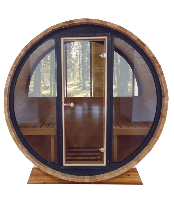 Falls es schon immer Ihr Traum war, während eines Saunagangs mitten in die Natur zu blicken, dann geht dieser mit der Finnhaus Vollglasfront jetzt in Erfüllung. Je nachdem, wo Sie Ihr Saunfass aufstellen, schauen Sie vielleicht einer Kuhherde beim Grasen auf einer saftigen Wiese zu oder genießen eine wunderschöne Kulisse mit einem lebendigen Bächlein, einer Gebirgskette, einem spiegelnden See oder einem üppigen Tannenwald. Sie werden vor allem über den lichtdurchfluteten Innenraum begeistert sein, den die transparente Front bewirkt. Fortan genießen Sie ein extraordinäres Sauna-Erlebnis mit völlig neuem Komfort.